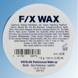 F/X Wax is a modelling wax used for the alteration of natural facial shapes and for simulating realistic-looking injuries. Remove product with a spatula and apply on the skin and form it. With the fingers, which have previously been wetted with a gel, the surface is smoothed and the edges are equalized. Powder with Translucent Powder. The surface is coated with Sealer thinly. Now make-up can be applied.